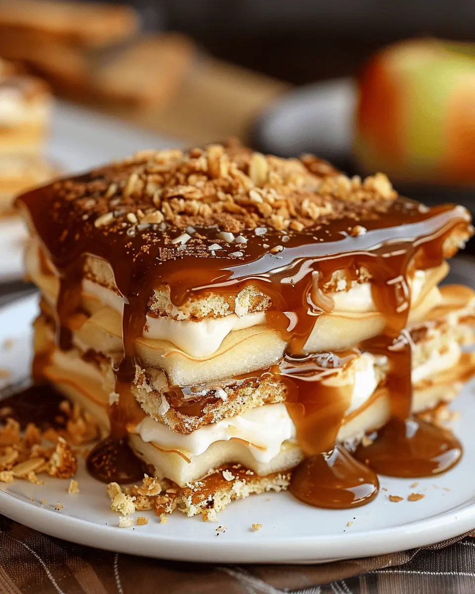 Layered Elegance: Instead of a traditional cake pan, use individual glass cups to layer the caramel apple eclair cake. This not only looks stunning but allows guests to see the beautiful layers of cream and apple filling.