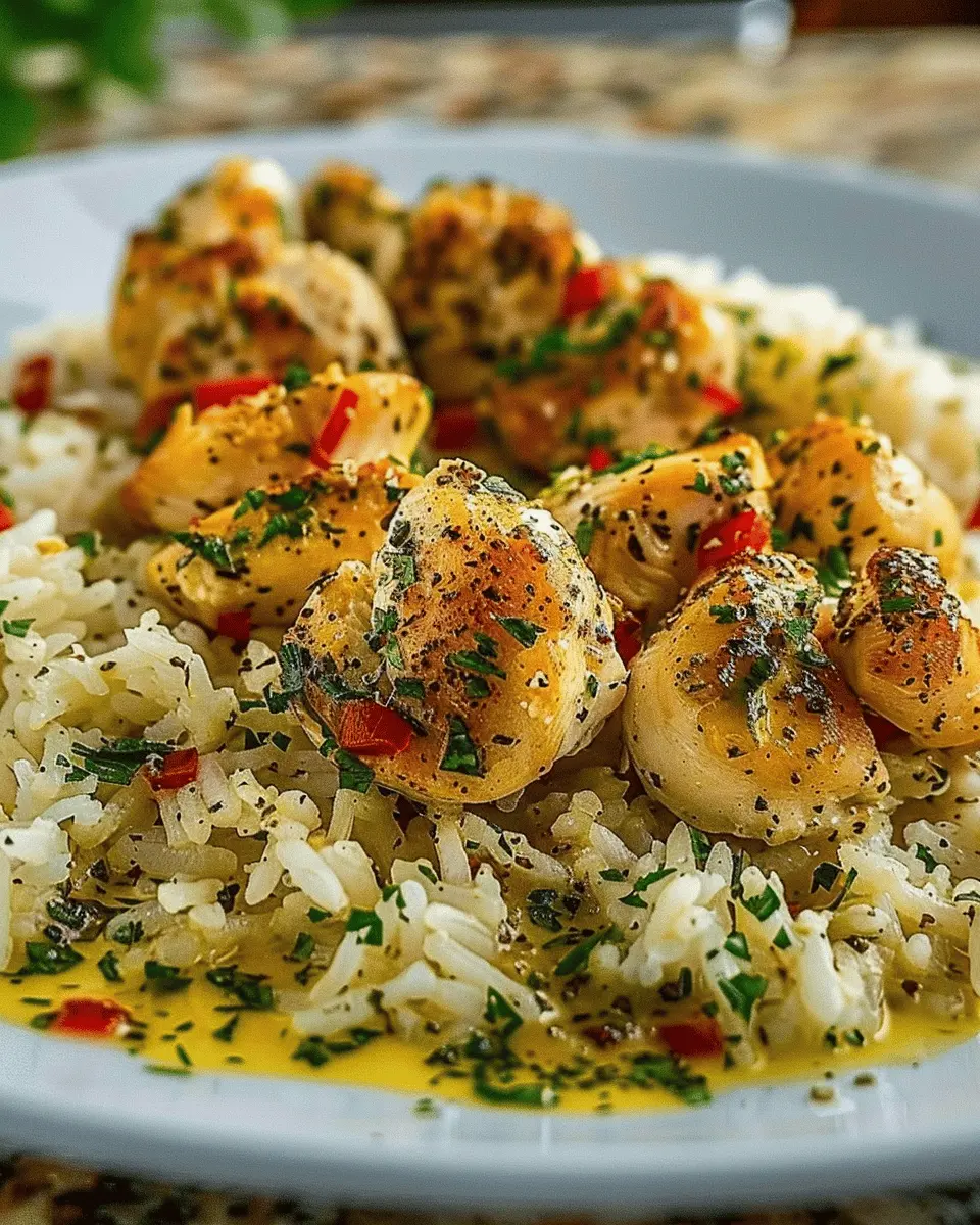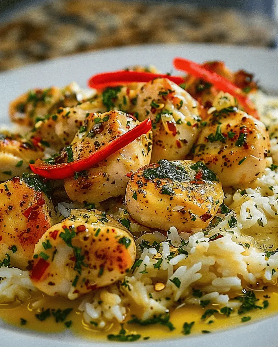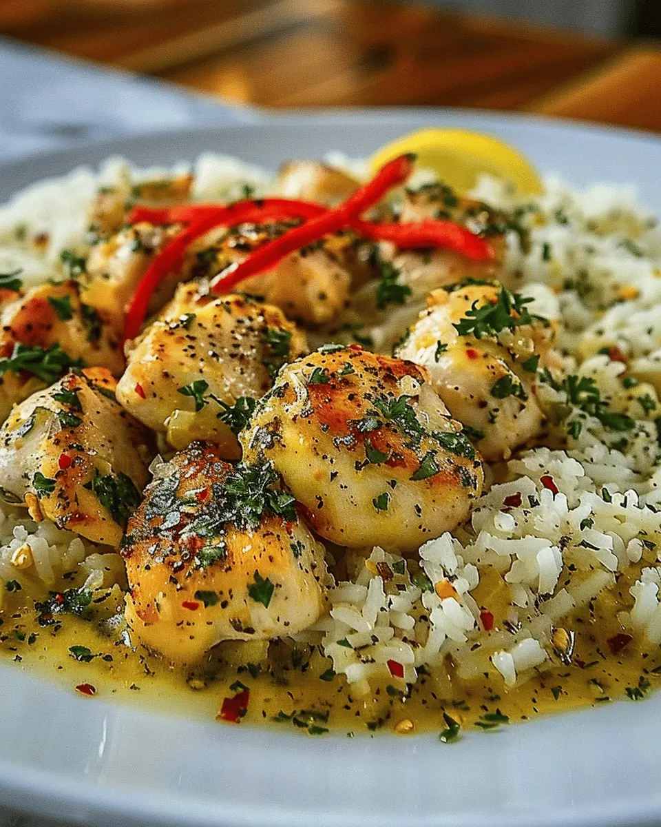 A delightful fusion of succulent chicken scampi served over a bed of creamy garlic parmesan rice, perfect for a comforting meal.