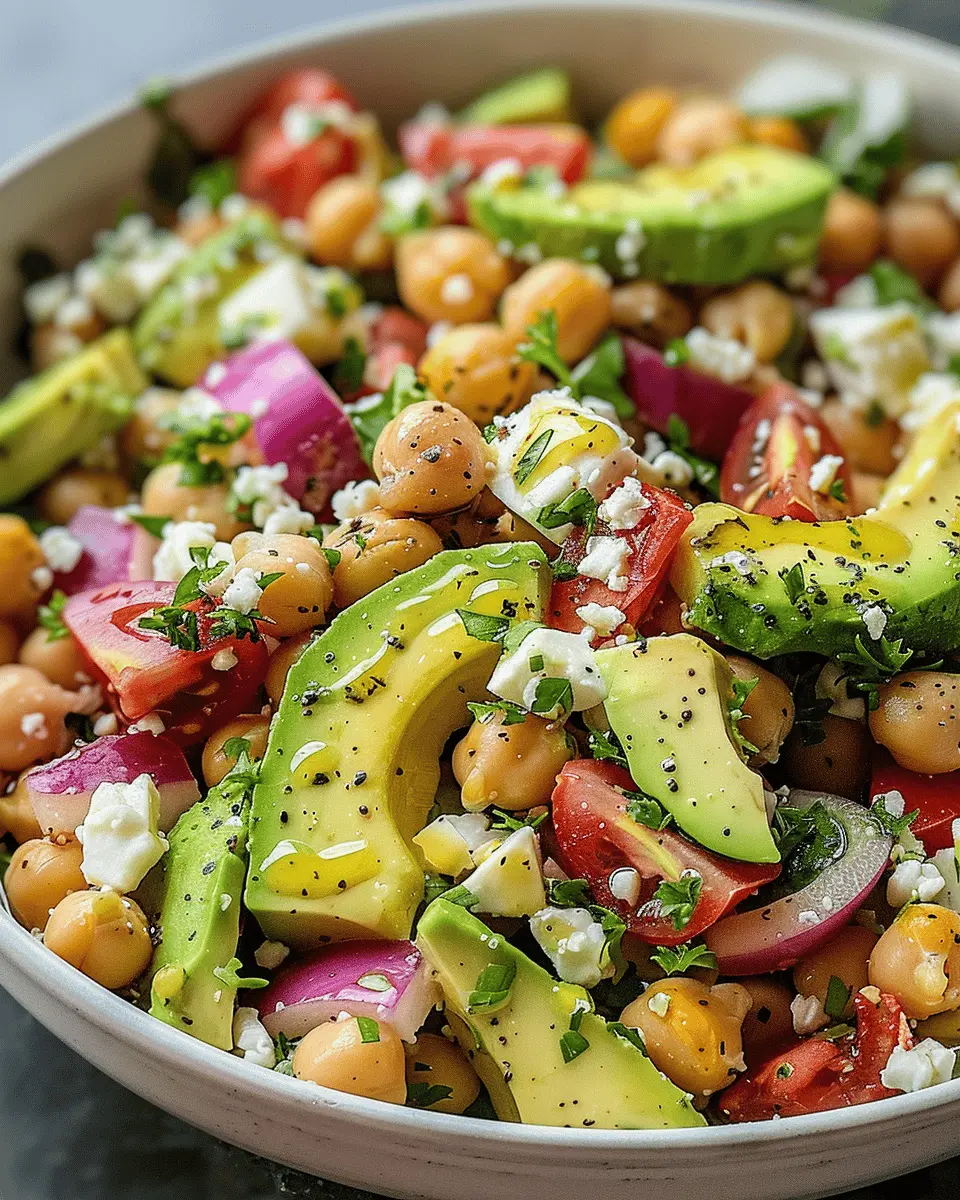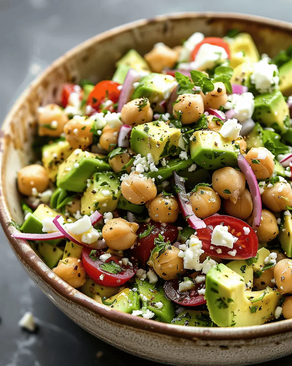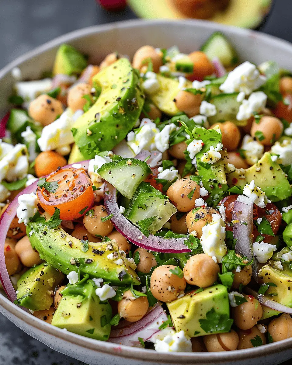 A refreshing and nutritious salad featuring chickpeas, feta, and avocado.