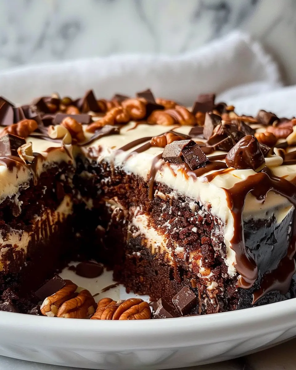 Once out of the oven, allow it to cool before slicing. The delightful combination of textures—chewy coconut, crunchy pecans, creamy cheese, and moist chocolate cake—will have everyone at the table begging for seconds!