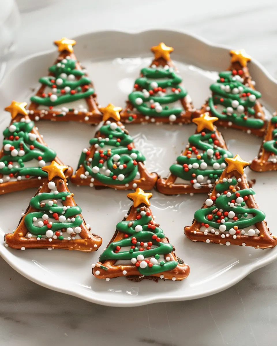 Arrange your pretzel trees on a decorative platter or a cake stand. You can use green cellophane beneath them to mimic grass, or sprinkle edible glitter around for that extra sparkle. This will not only make your treat look more inviting but also add a fun atmosphere to any holiday gathering.
