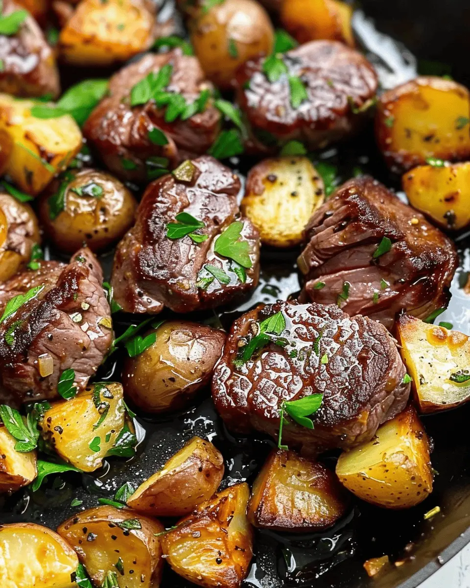 Achieving tender and juicy Garlic Butter Steak Bites and Potatoes starts with selecting the right cut of beef—look for sirloin or filet mignon for optimal flavor. Ensure your steak is at room temperature before searing to promote even cooking. Use a hot cast-iron skillet—this not only adds a beautiful crust but also locks in those delicious juices! Remember to avoid overcrowding the pan; this can lead to steaming instead of searing. Finally, let your steak rest for a few minutes before serving; this helps in redistributing the juices throughout the meat.