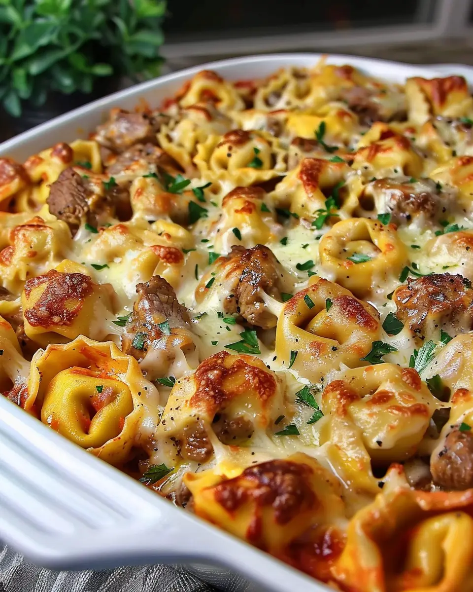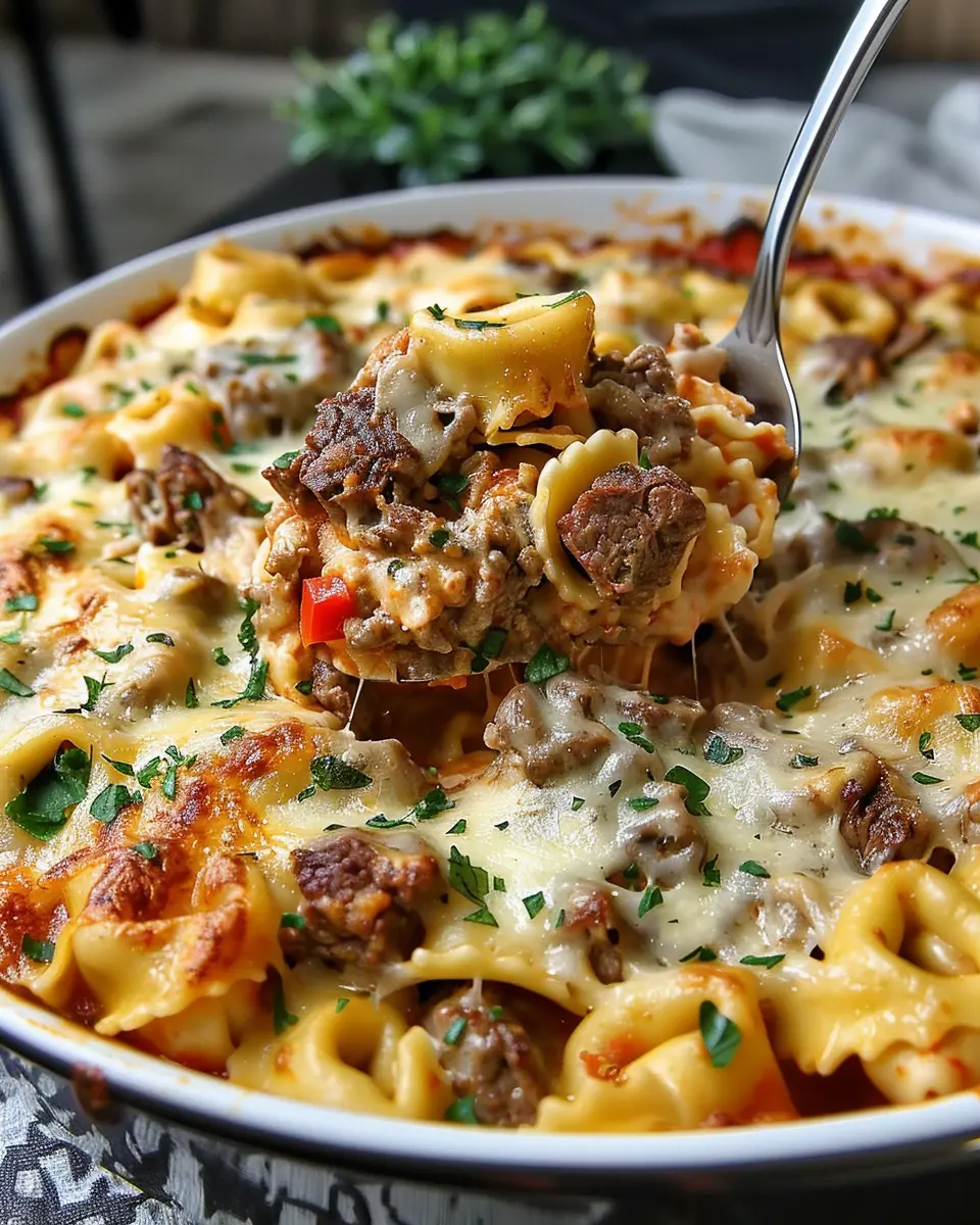 A delicious and easy-to-make casserole featuring cheesy tortellini and steak, perfect for family dinners.