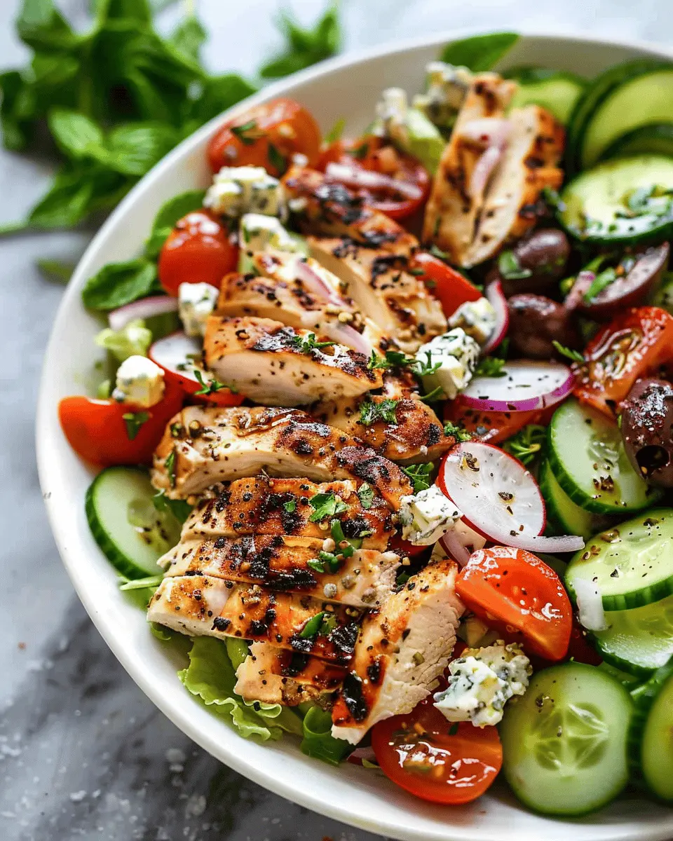 Not only is this salad easy to whip up, but it’s also incredibly nourishing. Packed with fiber from fresh veggies and protein from grilled chicken, it supports your active lifestyle. According to the USDA, veggies like tomatoes, cucumbers, and bell peppers are rich in vitamins and antioxidants, essential for maintaining overall health. Adding grilled chicken not only elevates the dish in flavor but also keeps you feeling fuller longer — perfect for that after-work hunger!