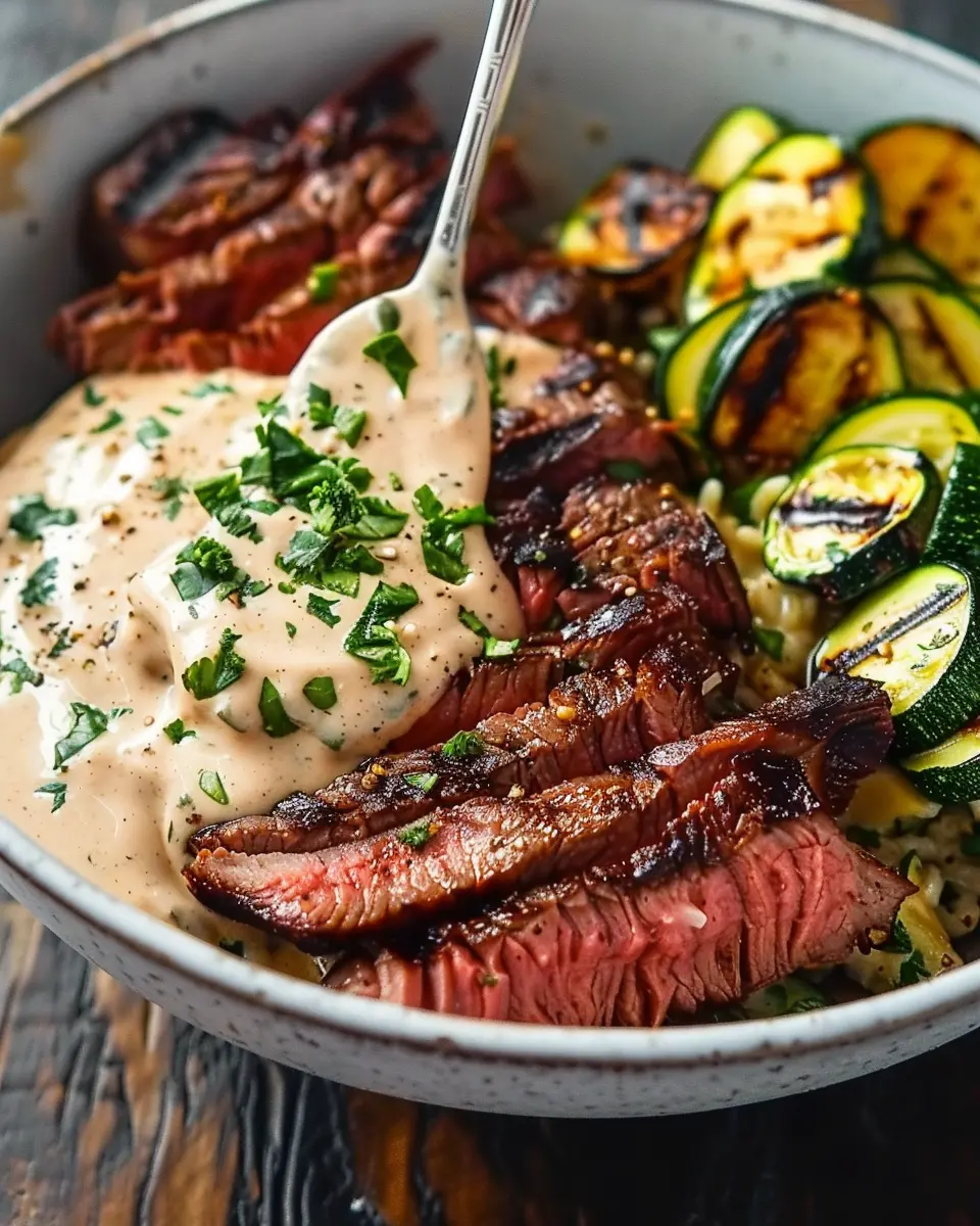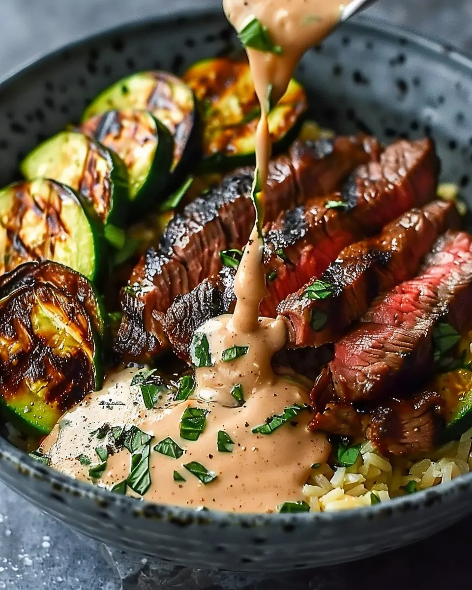 Keywords: Grilled Steak Bowl, Creamy Sauce, Grilled Zucchini