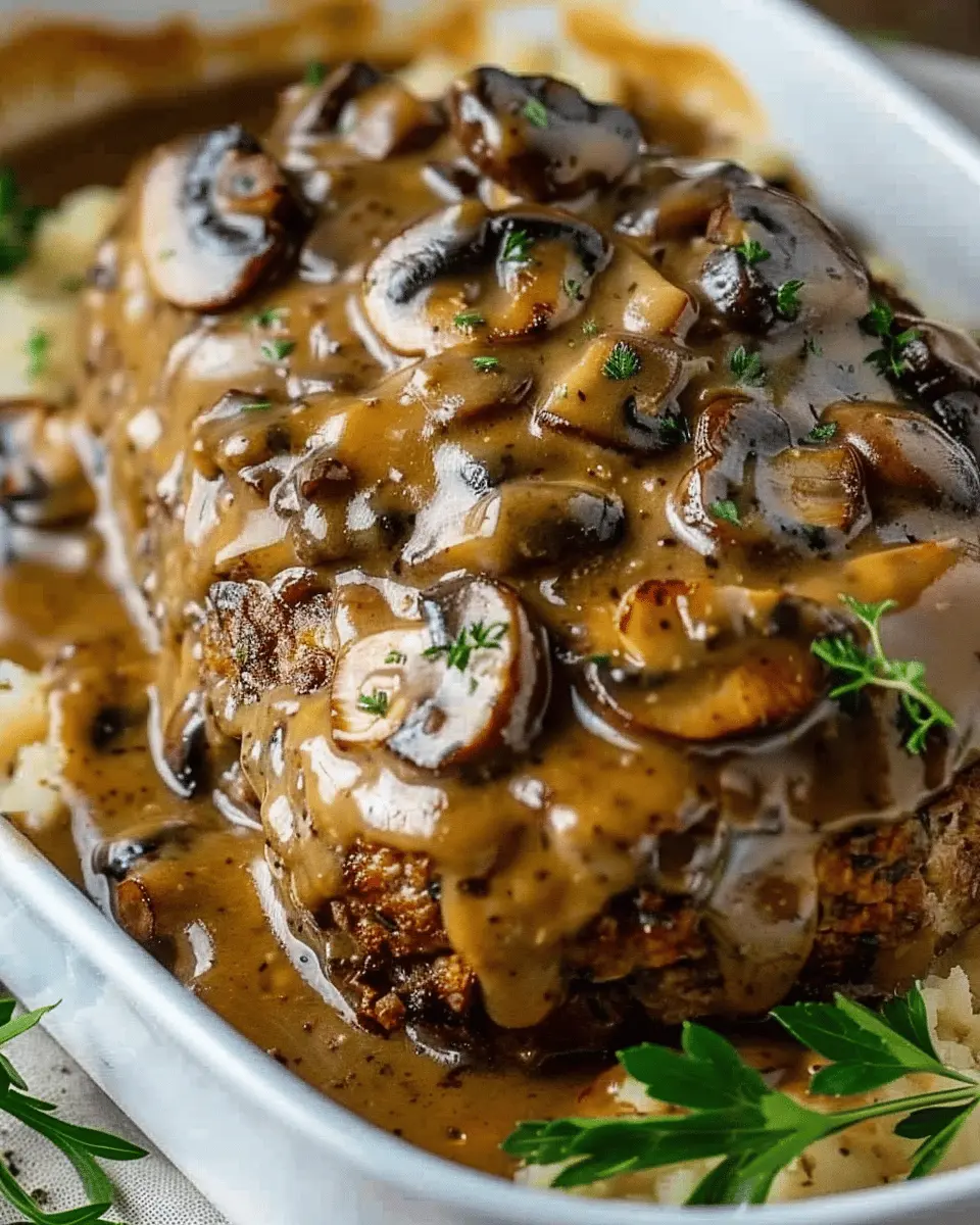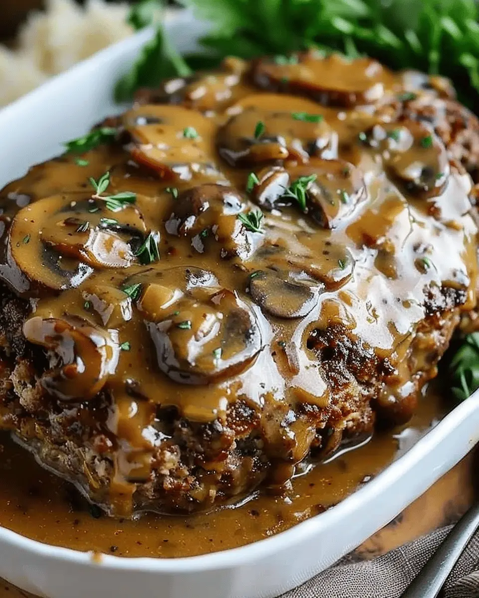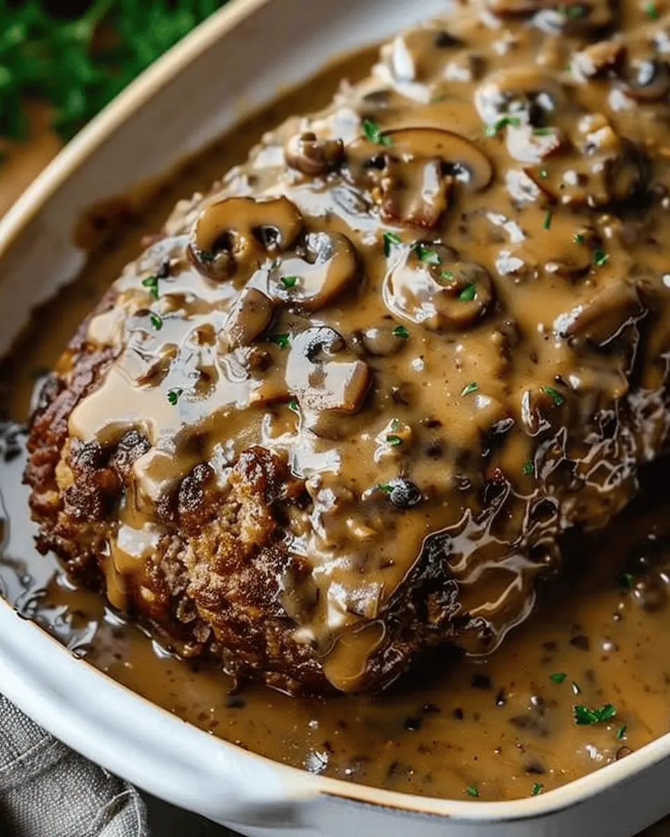 A comforting and delicious meatloaf topped with savory mushroom gravy, perfect for family dinners.