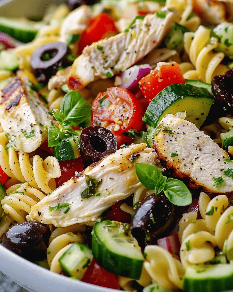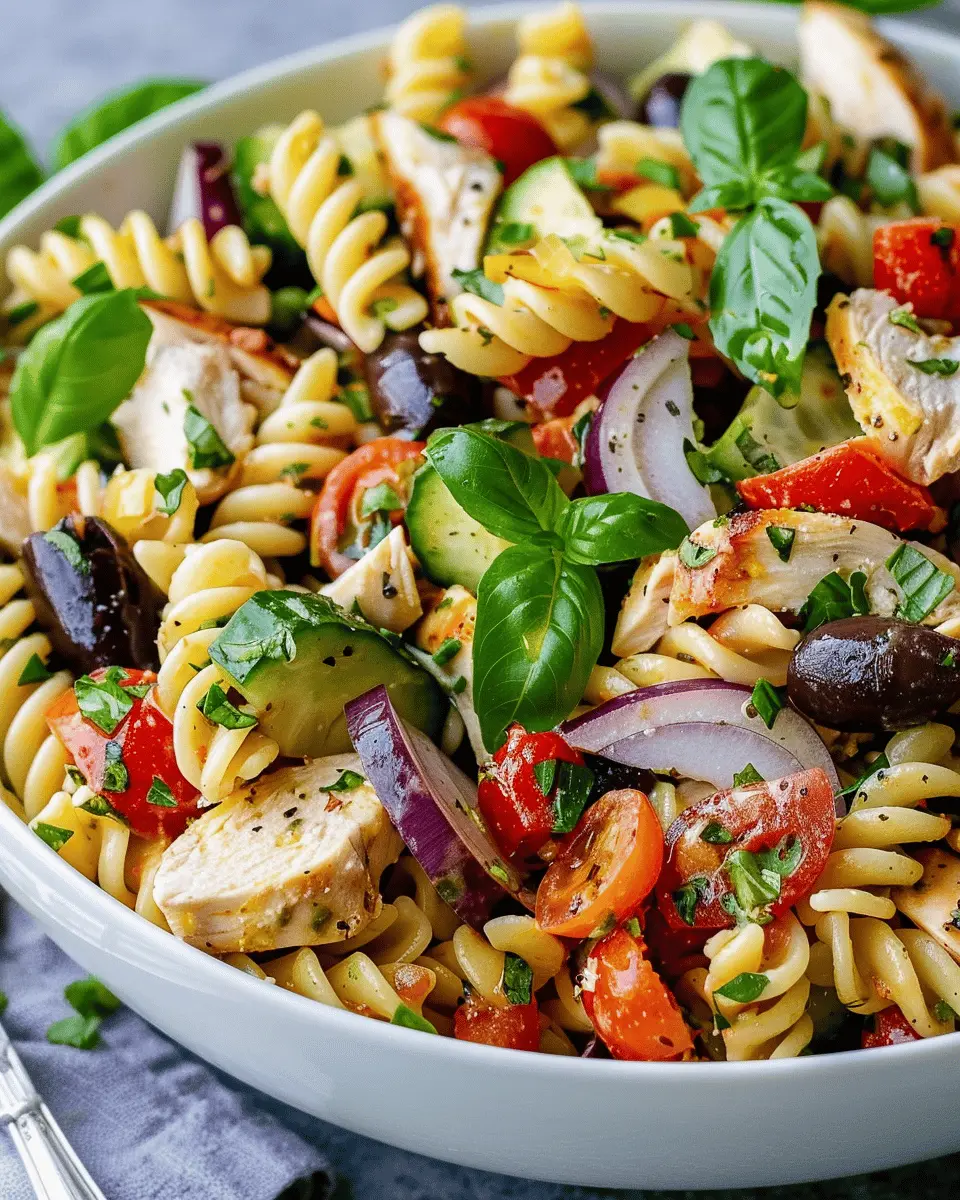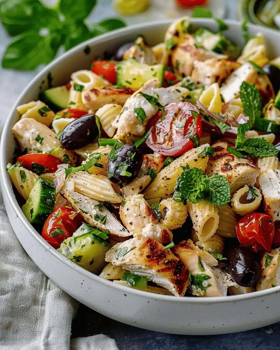 A delicious Mediterranean chicken pasta salad that combines fresh ingredients for a vibrant meal.