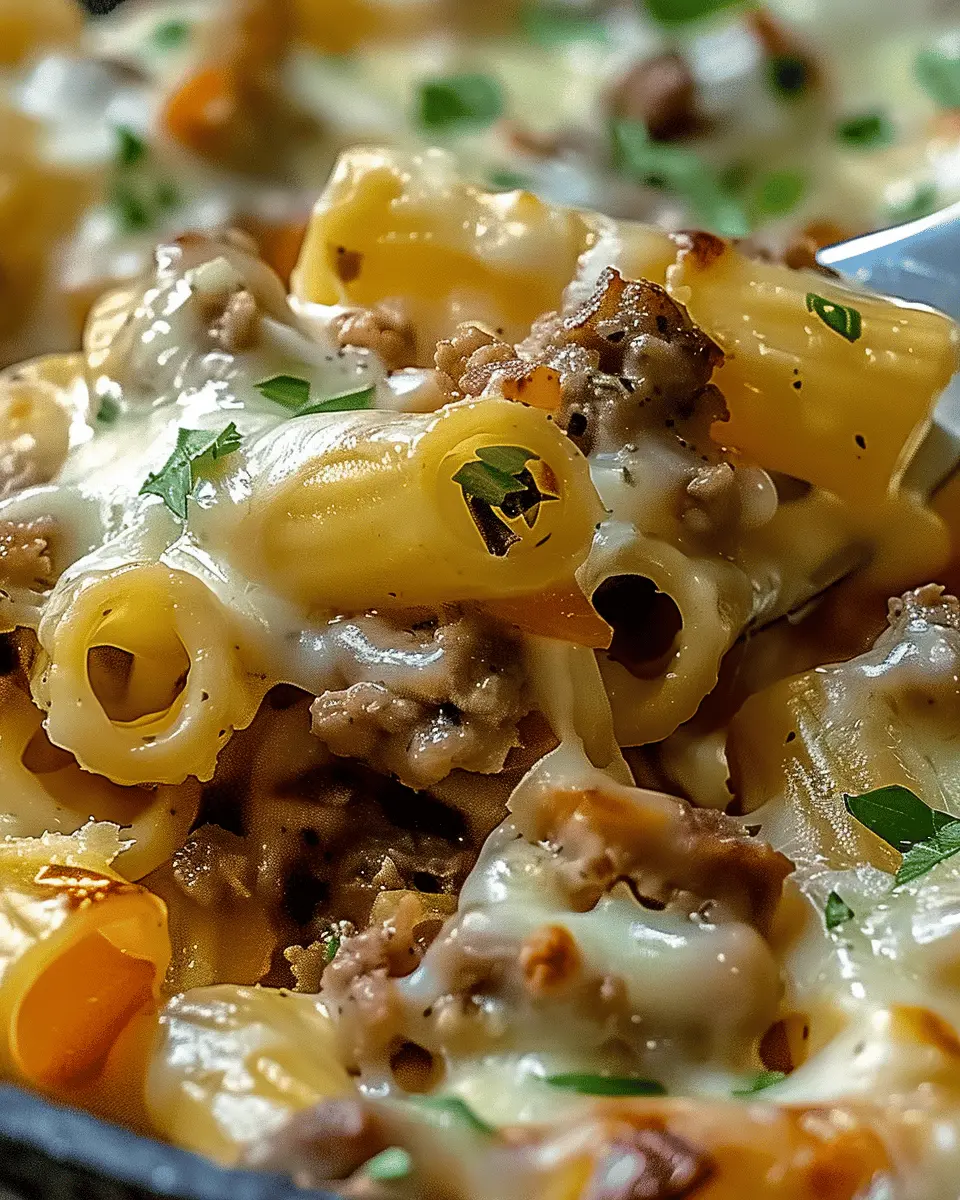 PrintPhilly Cheesesteak Pasta: A Delicious Twist with Turkey Bacon