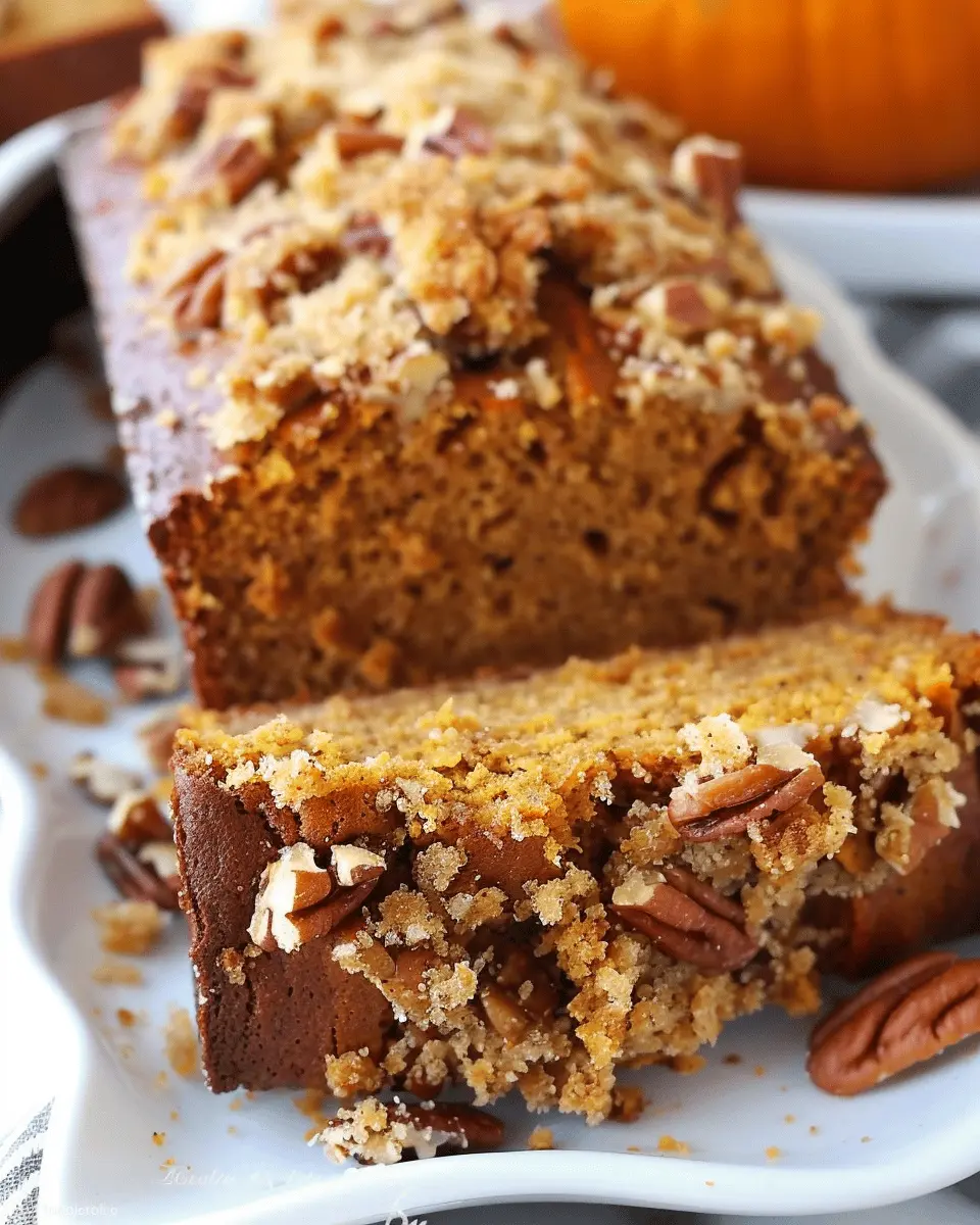 A delightful recipe for pumpkin bread topped with a brown sugar pecan crumble.