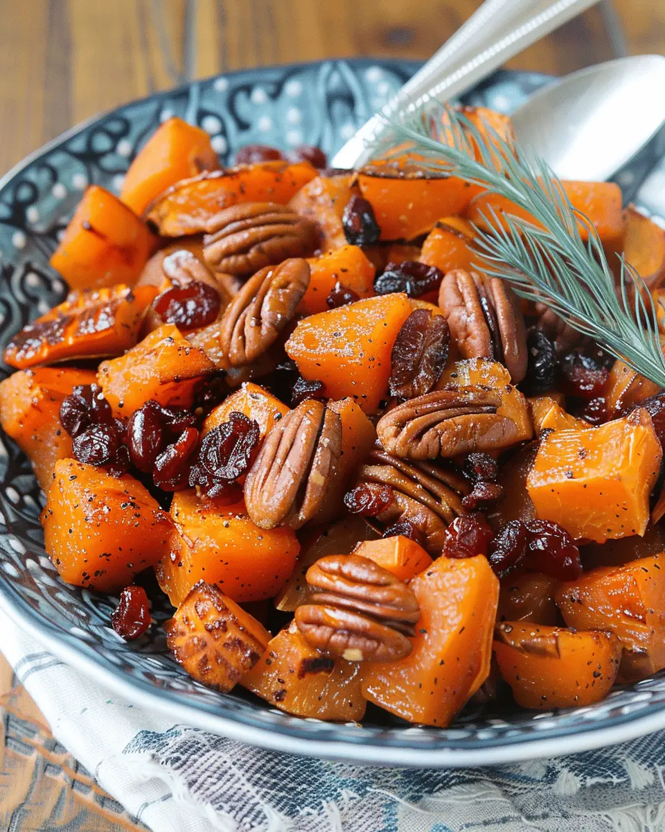 This Roasted Butternut Squash with Cranberries and Pecans is a delightful fall dish that combines sweet and savory flavors.