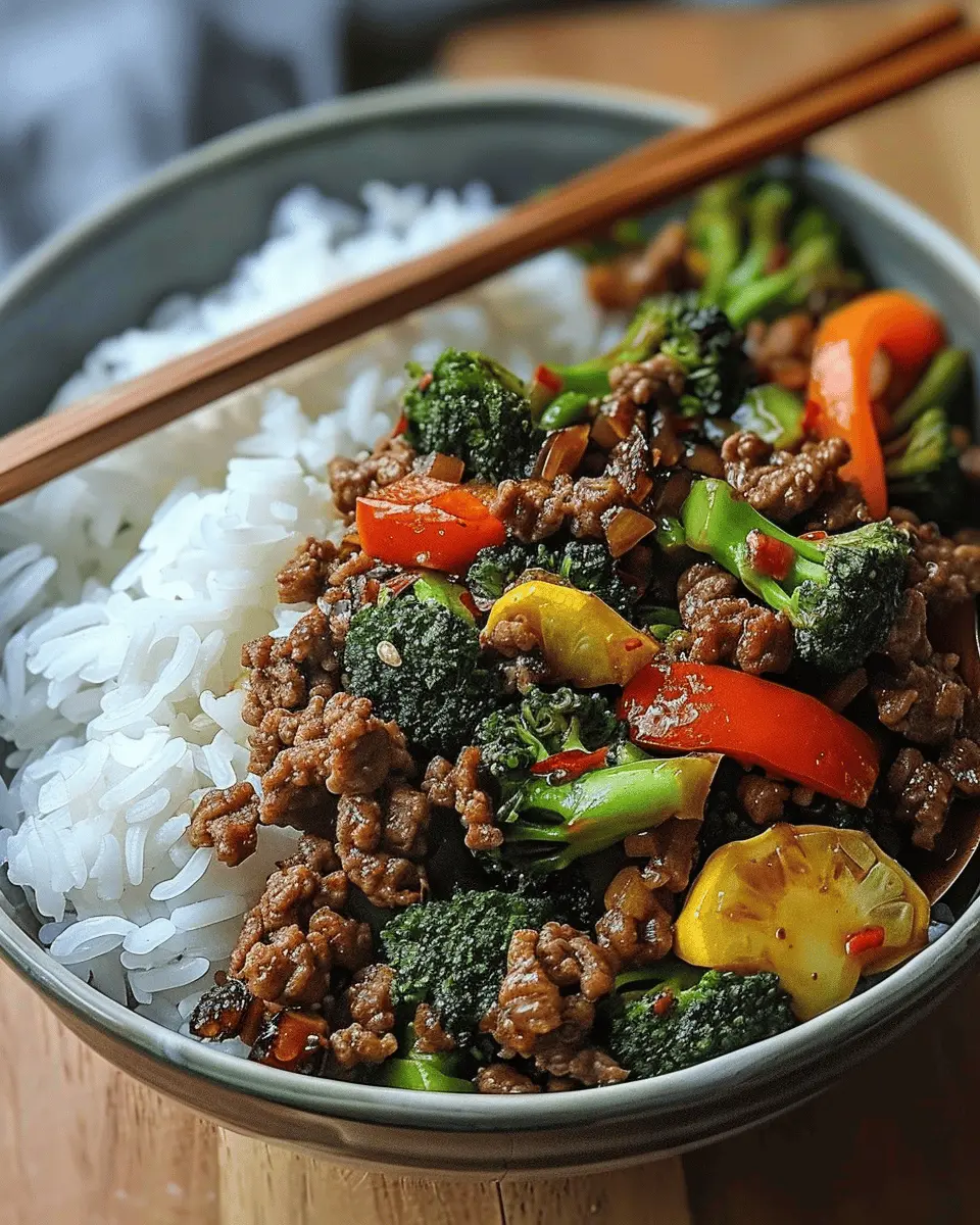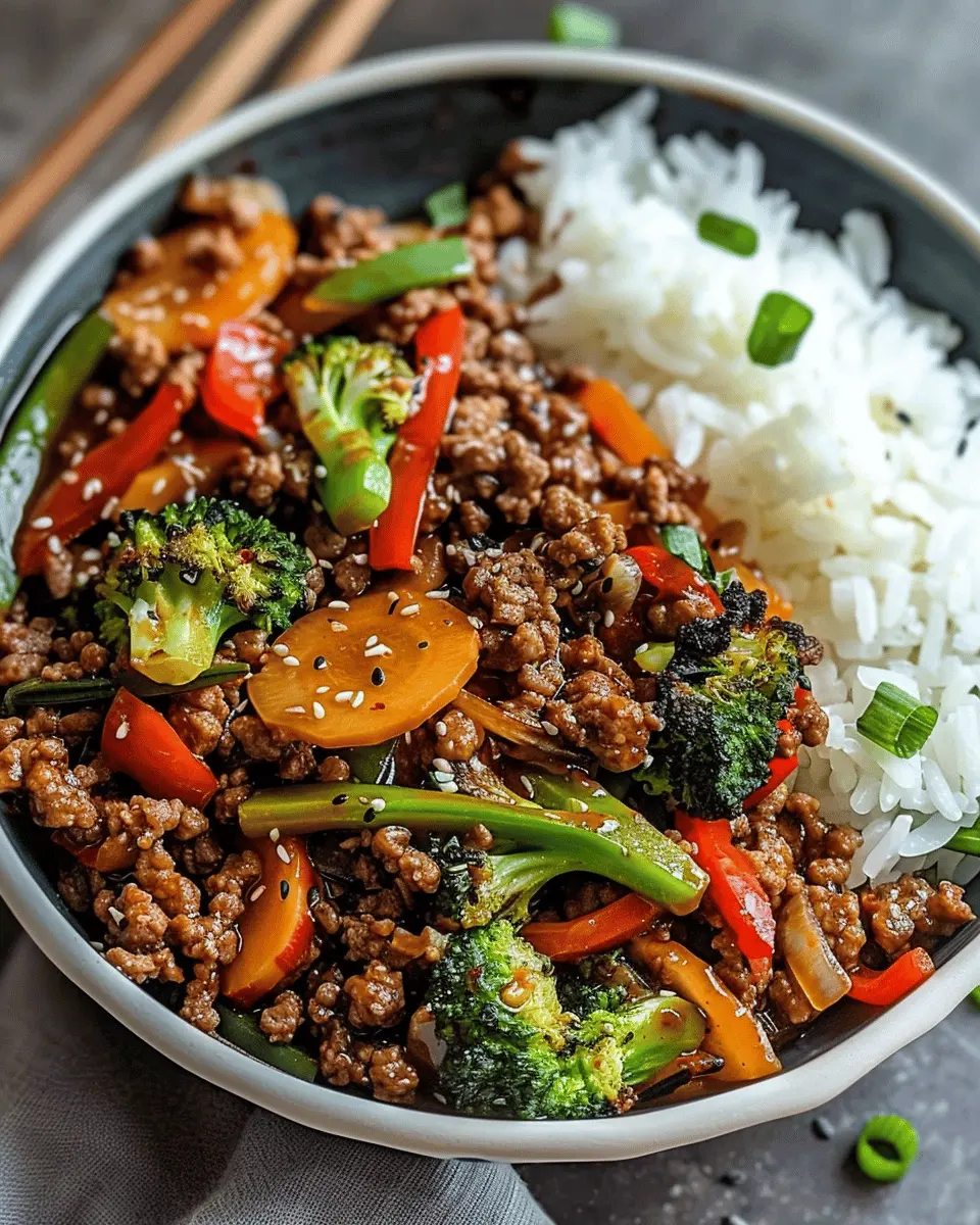 Enjoy a delicious and quick meal with this Spicy Ground Beef Stir-Fry Bowl, featuring garlic veggies and steamy rice.