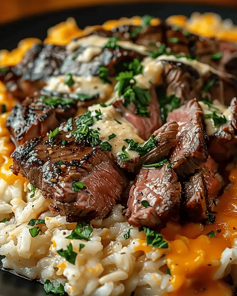- Scoop a generous portion of your creamy queso rice onto a plate, artfully layer the steak on top, and garnish with fresh cilantro.